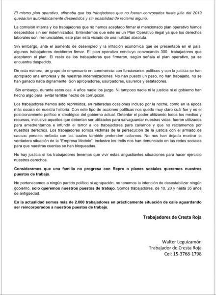 Los trabajadores, por medio de una carta abierta dirigida a los trabajadores y los medios de comunicación, denunciaron días atrás que es mentira que se haya solucionado el conflicto de Cresta Roja.