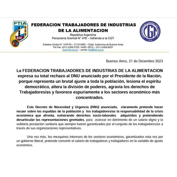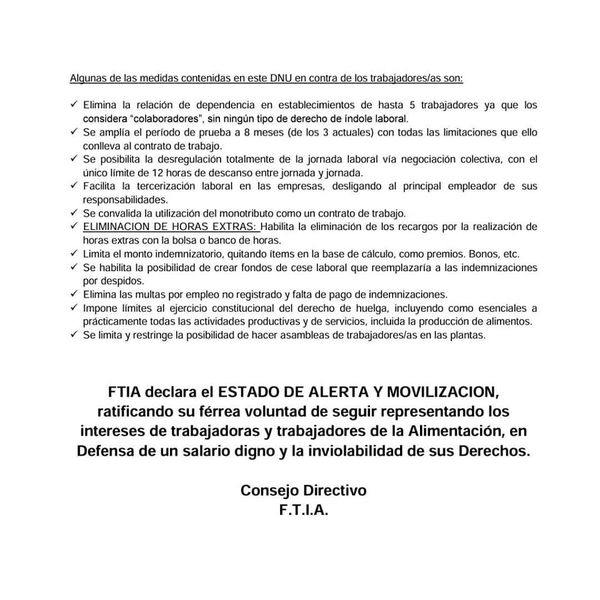 La medida fue determinada por el Consejo Directivo de la Federación de Trabajadores de la alimentación (FTIA), «ante el brutal ajuste al pueblo y el conjunto de la clase trabajadora que expresa el DNU anunciado por el Presidente de la Nación, y el espurio intento de favorecer a los sectores más económico que representa».