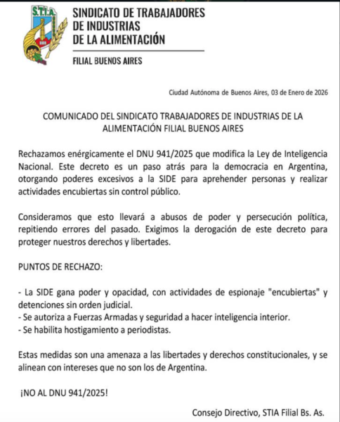 El Sindicato de Trabajadores de Industrias de la Alimentación (STIA), filial Buenos Aires, expresó un rechazo categórico al decreto. En un comunicado difundido por su Consejo Directivo, el gremio advirtió que la medida “es un paso atrás para la democracia en Argentina”.
