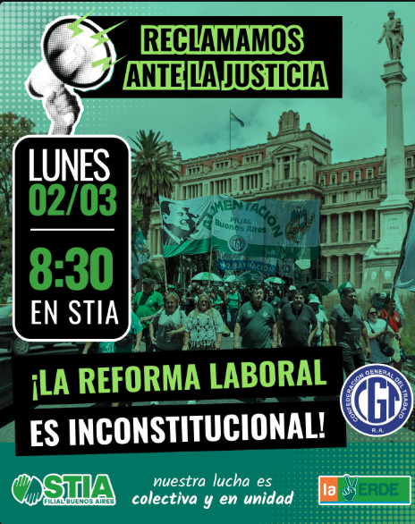 El gremio de Alimentación convocó a los trabajadores del sector a concentrarse desde las 8:30 en la sede del sindicato para sumarse a la movilización al Palacio de Tribunales contra la reforma laboral de Javier Milei. Los gremios confederados, en unidad con la CGT, reclaman la defensa de derechos conquistados y anunciaron un planteo de inconstitucionalidad frente a la nueva Ley Laboral que consideran lesiva para las y los trabajadores.