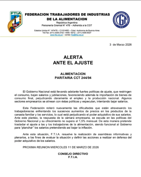 En un contexto de creciente incertidumbre económica y debate sobre el futuro del trabajo en Argentina, la Federación de Trabajadores de la Industria de la Alimentación (FTIA) difundió un comunicado en el que advierte sobre los riesgos que enfrenta el sector.
